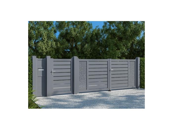 Le portail alu Arbois peut être associé en toute sérénité aux clôtures Vanne, Mélissey ou Ivrey et il peut être assorti d'un portillon Arbois en tôle perforée pour une esthétique homogène.